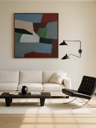 One of my abstract canvases, built around deep green and warm terracotta tones, illustrates this approach perfectly. Its structured composition and subtle texture make it an ideal companion for interiors dominated by natural materials such as wood, stone, and linen. Placed above a minimalist sofa or in a calm bedroom, the painting becomes a focal point that radiates serenity and understated luxury. Rather than shouting for attention, it enriches the atmosphere with quiet confidence.