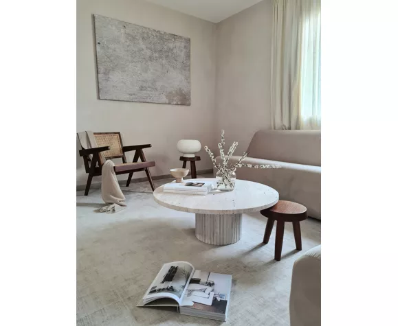 Une jolie table basse en travertin s'adoptera à merveille avec un parquet en bois ou une moquette aux mêmes tons que la pierre tout en habillant un intérieur minimaliste, contemporain et épuré.